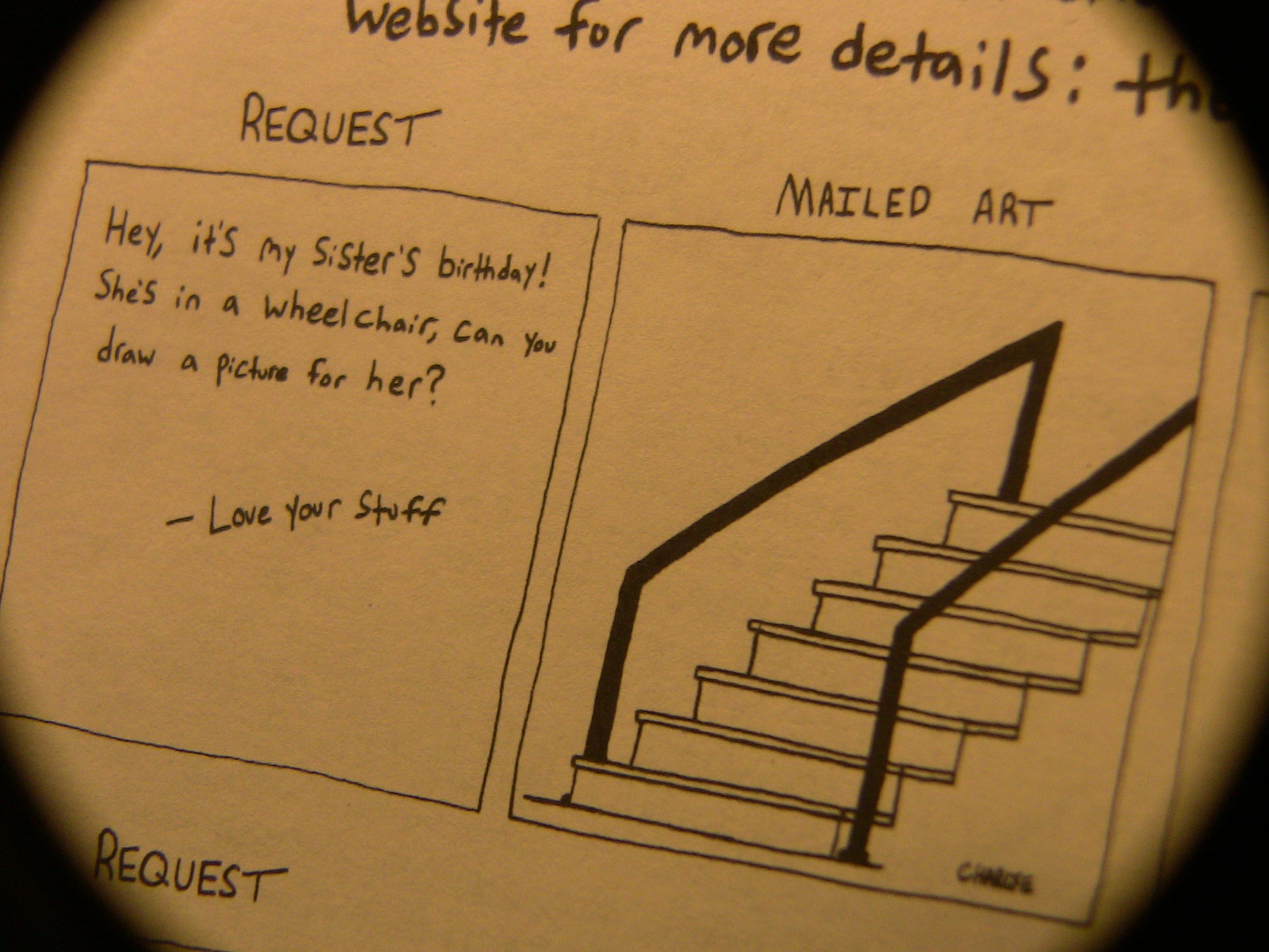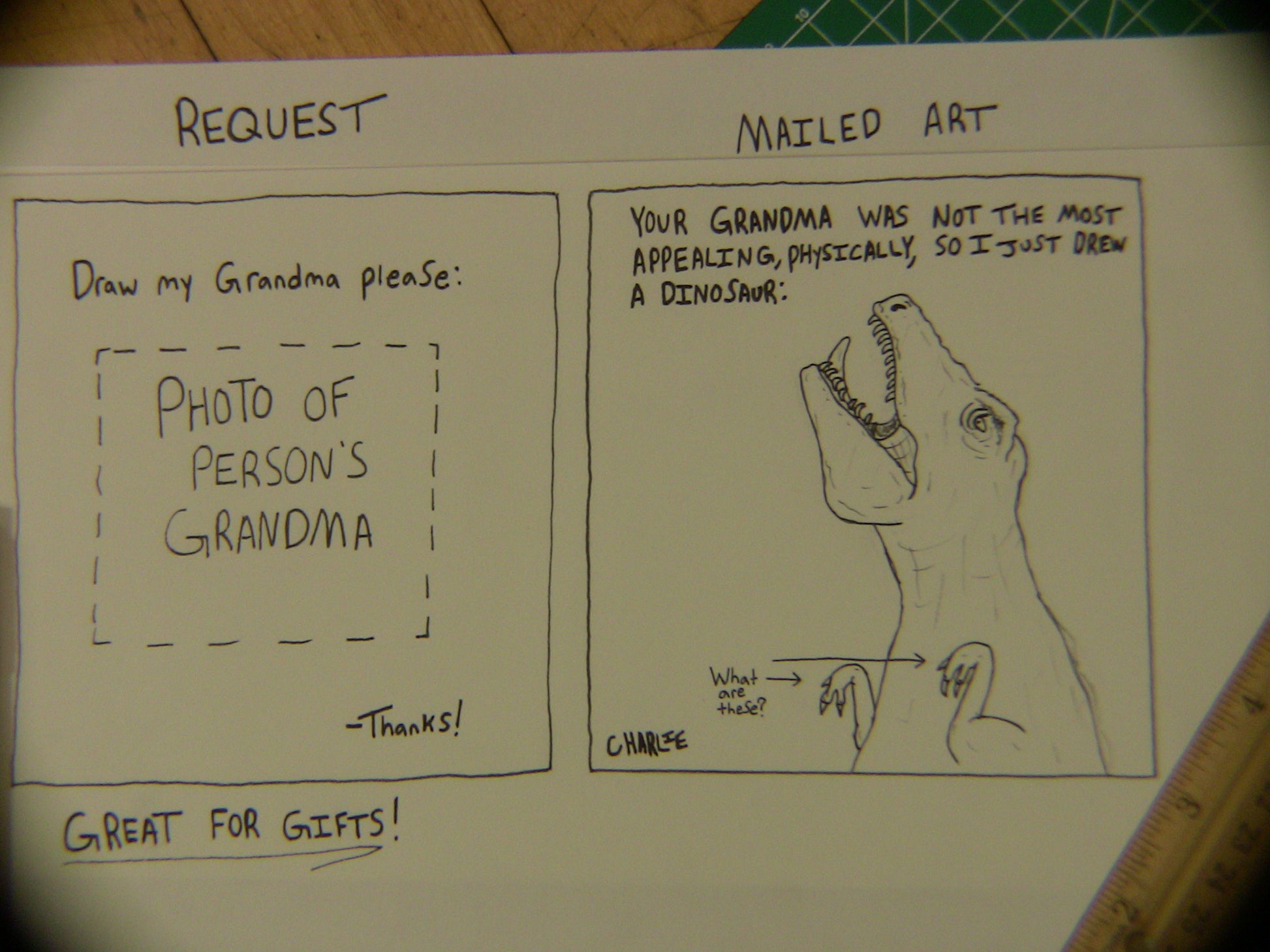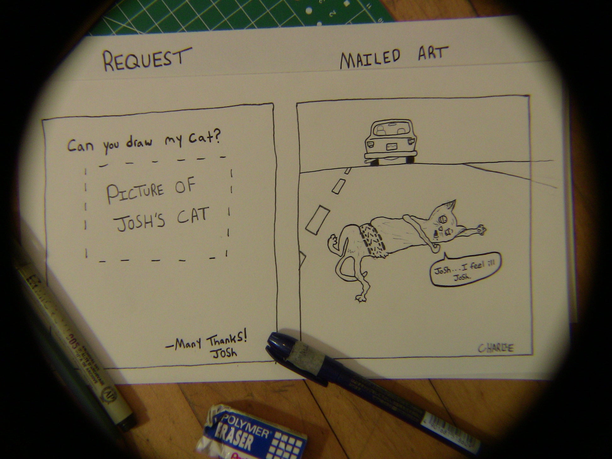 It will be hand drawn on some thickish cardstock and mailed to you, all for 25 big ones—wow! One payment equates to one drawing on 5.5in by 8.5in cardstock.